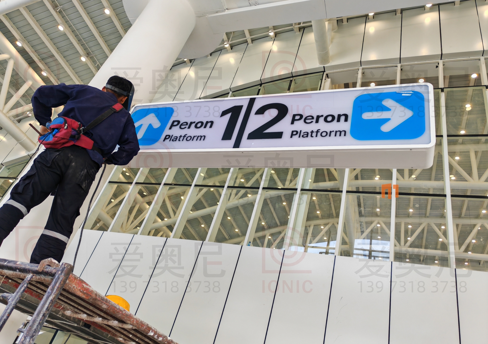 下圖是愛奧尼標識公司為印尼雅萬高鐵帕達拉郎站制作和安裝指導服務的靜態標識。客戶對項目制作工藝非常滿意。湖南愛奧尼標識工程有限公司是一家專業的鐵路標識,導向標識,高鐵站標識,站房標識,靜態標識設計制作安裝服務公司,擁有15年標識設計經驗,100多名專業生產團隊,獲得ISO9001質量管理體系認證等數10項榮譽資質證書,電話:400-0731-050,13973183738